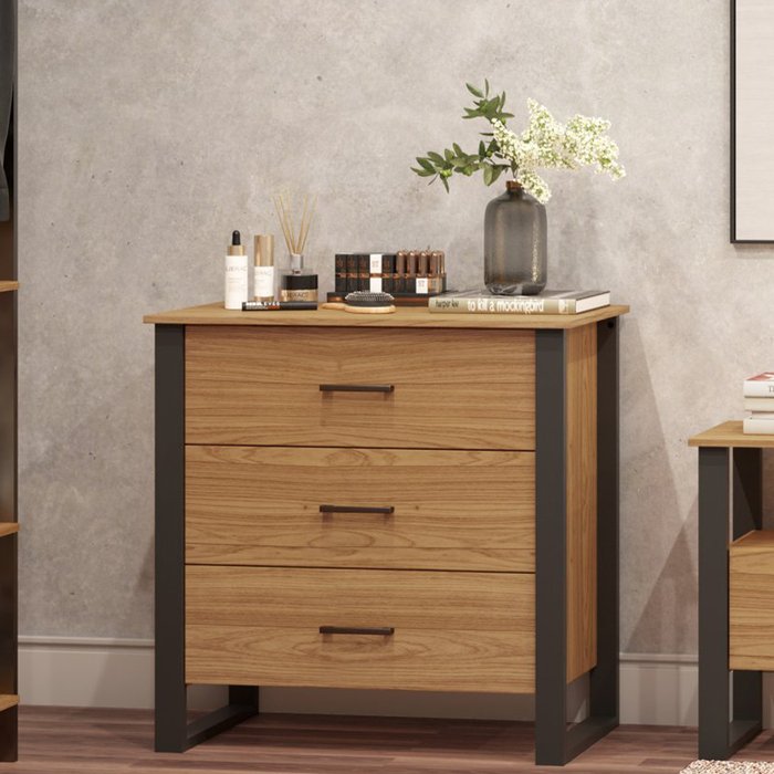 Complemente o seu dormitório com a Cômoda Estilo Industrial F38 Pradel Móveis. Ela possui três gavetas para você armazenar pequenas peças e objetos, trazendo mais praticidade para o dia a dia. É fabricada 100% em MDF e acabamento em pintura UV com 6 camadas de proteção, garantindo maior durabilidade ao produto.