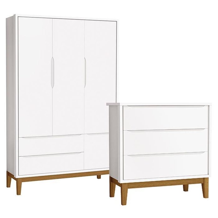 Cômoda Gaveteiro com Guarda Roupa Infantil 3 Portas New Classic Branco com Pés Madeira - Reller