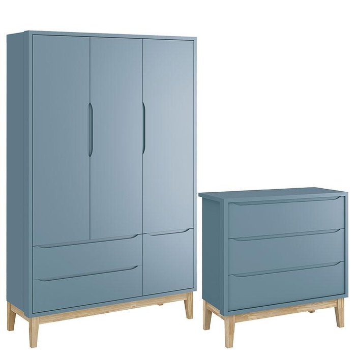 Cômoda Gaveteiro e Guarda Roupa Infantil 3 Portas New Classic Azul com Pés Madeira Natural - Reller