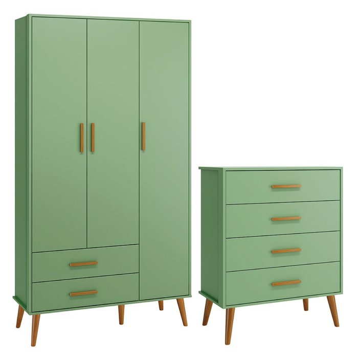 Comoda Gaveteiro e Guarda Roupa Isis Pés Retrô 3 Portas 2 Gavetas Infantil Botanico Fosco - Reller Botânico Fosco