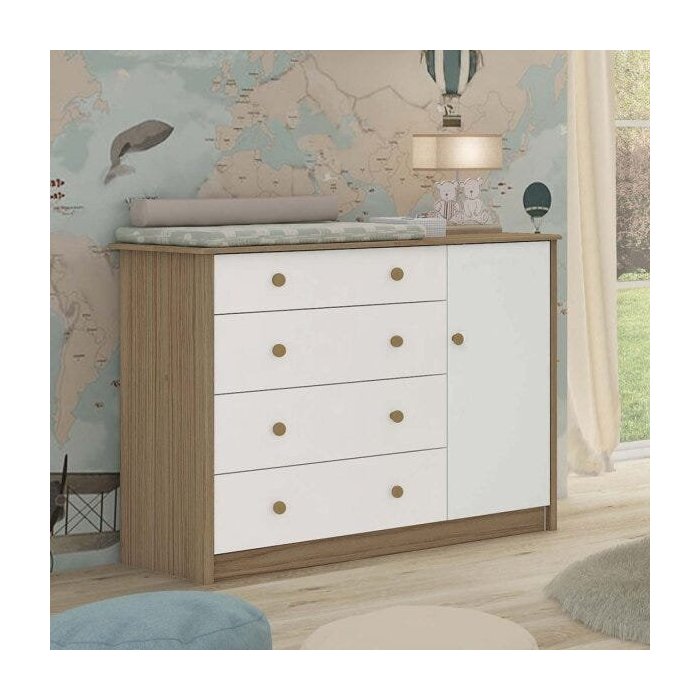 Cômoda Infantil 1 Porta 4 Gavetas em MDF Dani Móveis Peroba Branco Brilho/Carvalho