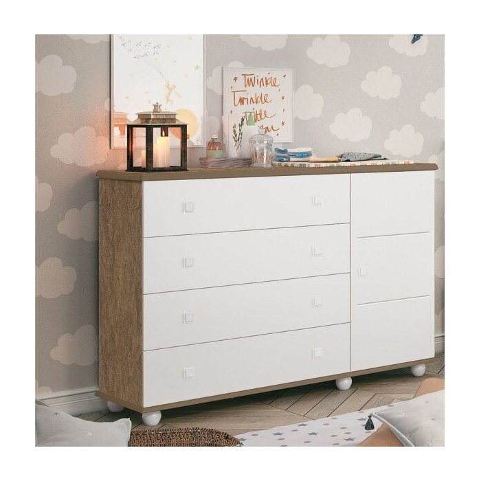 Cômoda Infantil 1 Porta 4 Gavetas Premium Planet Baby Amêndoa/Branco