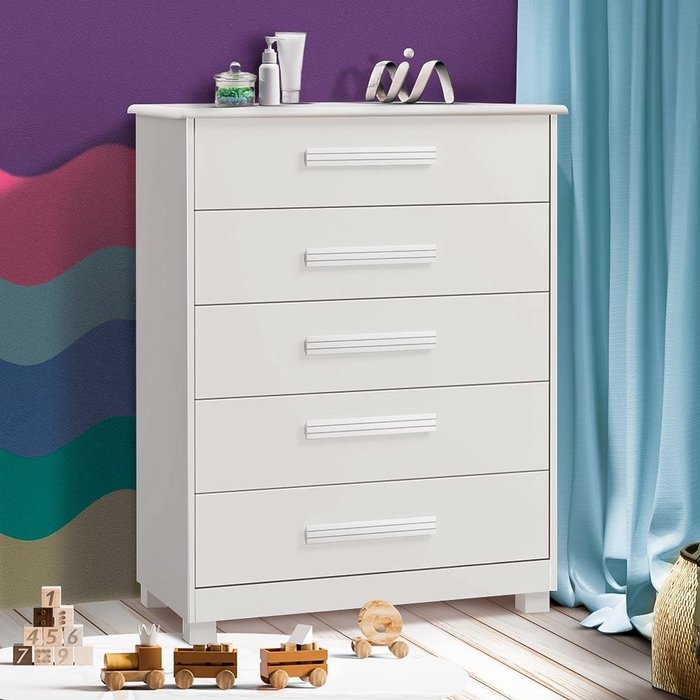 Dimensões do produto: Largura 90 cm; Profundidade 45 cm; Altura 115,5 cm.Itens inclusos: 1 CômodaComplexidade da montagem: Média, pode ser montado por apenas uma pessoa e/ou necessite de maior conhecimento para montagem.- 100% MDF- Puxadores em MDF- Pés em madeira- 5 gavetas - Reforço do fundo da gaveta fixado com minifix- Perfeita para o quartinho de sua criançaRecomendações de uso, manutenção e limpeza: Limpar com flanela ou pano macio seco, não utilizar produtos abrasivos, desengordurantes, álcool ou solvente. Não expor o produto diretamente a luz solar e à umidadeGarantia: 3 mesesOBS: Foto meramente ilustrativa, decorações não fazem parte do produto.