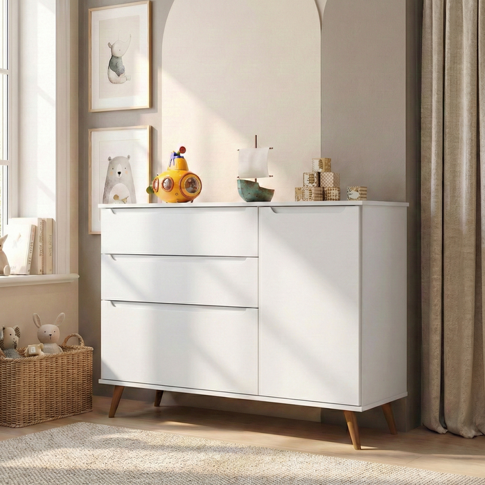 - Amplo Espaço de Organização: Conta com 3 gavetas espaçosas e 1 porta lateral com prateleira interna, ideal para guardar desde roupas e fraldas até brinquedos e acessórios, mantendo tudo ao alcance.