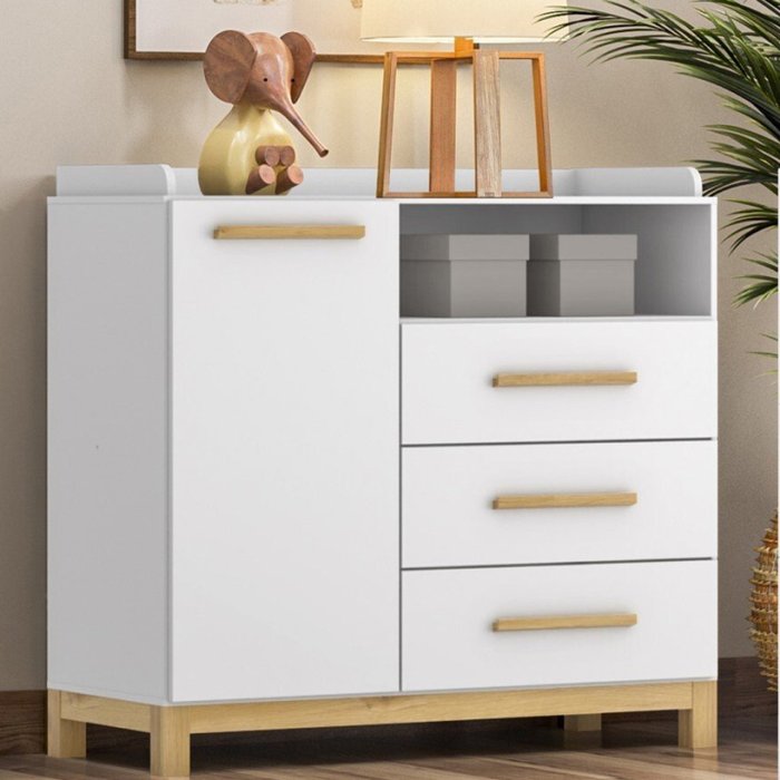 A cômoda Alegria vem complementar a linha deixando o quarto todo especial. Com medidas de 955mm de altura, 980mm de largura e 410mm de profundidade, suas gavetas são compostas de corrediças telescópicas que permite maior abertura das mesmas. Produzida em MDP, com pés, rodapés e apliques puxadores em madeira, que garantem maior durabilidade ao produto. Possui amplo espaço interno que garante melhor organização das roupas e pertences. Com molduras trocador sobre o tampo, proporcionando maior segurança ao seu bebê. Este produto é ideal para deixar o quartinho ainda mais especial.
