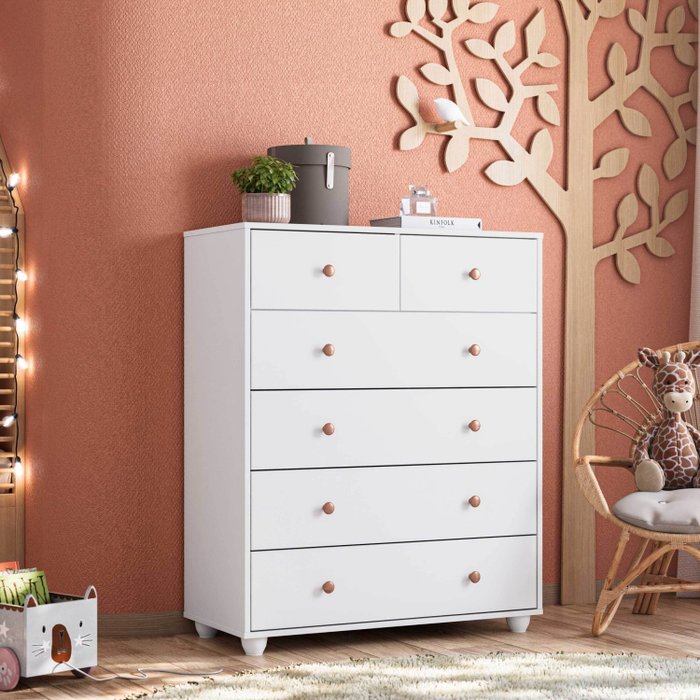 A Cômoda Balão é um produto com design atemporal e um toque de modernidade, seus puxadores arredondados e com acabamento metalizado bronze dão um charme a mais ao produto. Possui 06 gavetas com corrediças telescópicas, trava de sustentação nas gavetas maiores, caixaria e frentes de gavetas em 15 mm, interna 100% na cor do produto e pés inclusos