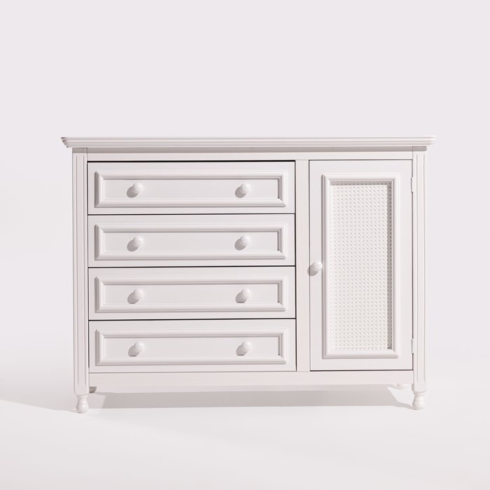 Apresentamos a incrível Cômoda Feliz da Só Berços, exclusiva e sofisticada, é a opção ideal para quem busca praticidade e organização. • Madeira maciça; • 4 gavetas em madeira; • 1 porta com tela trançada artesanal; • Disponível na cor branca; Não se preocupe com a montagem, ela é fácil e rápida, não precisando de um profissional para realizar! O manual de instruções vai junto com o produto para lhe auxiliar!