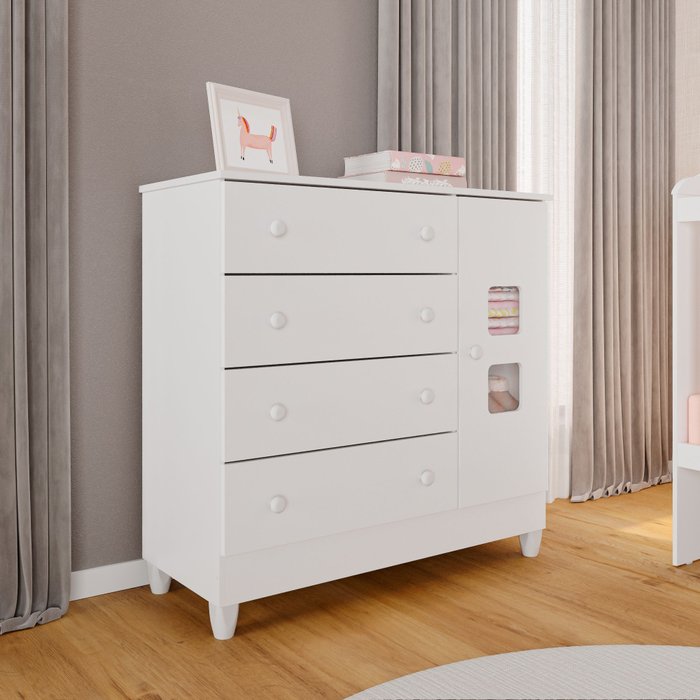 Cômoda Infantil Fraldario 1 Porta 4 Gavetas Mel Branco