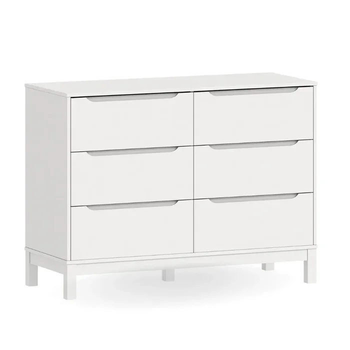 O modelo conta com 6 gavetas amplas, equipadas com corrediças telescópicas, que garantem abertura e fechamento suaves, silenciosos e seguros. Possui acabamento em laca atóxica e pintura atóxica, oferecendo mais segurança e conforto para o ambiente infantil.