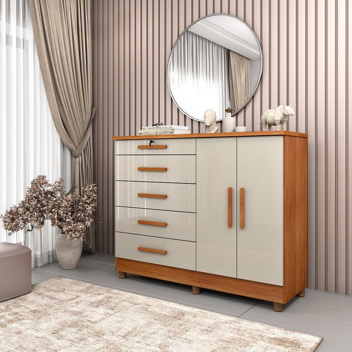 A Cômoda Istambul é um complemento primoroso tanto para decorar quanto para a organização. Ideais para as peças que ficam dobradas, as 5 gavetas são reforçadas pelo compartimento lateral e pelo tampo, que pode apoiar caixas organizadoras para aqueles objetos menores ou até mesmo alguns enfeites que vão deixar o espaço com a sua cara. Tamanho do produto montado: - Altura: 109cm | Largura: 136cm | Profundidade: 46cm. Produto em MDF, 5 gavetas com corrediças telescópicas 400mm, tampo em MDF 25mm, puxadores de madeira. Possui pés com regulagem de altura. Atenção: a tonalidade da cor pode variar de acordo com o lote do fabricante; e/ou as configurações de seu monitor. Imagens meramente ilustrativas: os objetos que ambientam as fotos não acompanham o produto.