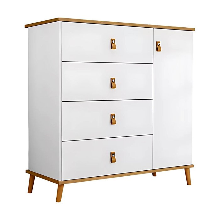 Com 4 gavetas amplas e 1 porta com prateleira interna, a Cômoda Sapateira Jujuba proporciona excelente capacidade de armazenamento, permitindo que você mantenha tudo organizado e ao alcance das mãos. Sua estrutura em MDF de alta qualidade, com acabamento em pintura UV, garante durabilidade, resistência e um toque sofisticado.