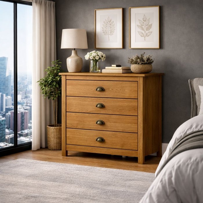 Seu design equilibrado combina proporções compactas com quatro gavetas amplas, permitindo organizar roupas, acessórios e itens pessoais de forma prática e eficiente. É uma peça versátil, perfeita para quartos, closets, ambientes multifuncionais ou como móvel de apoio, sem comprometer a estética do espaço.