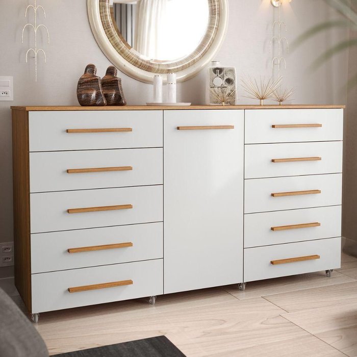 Cômoda Multiuso 10 Gavetas 1 Porta Ferrari com Rodízios Madeirado/off White Madeirado/Off White