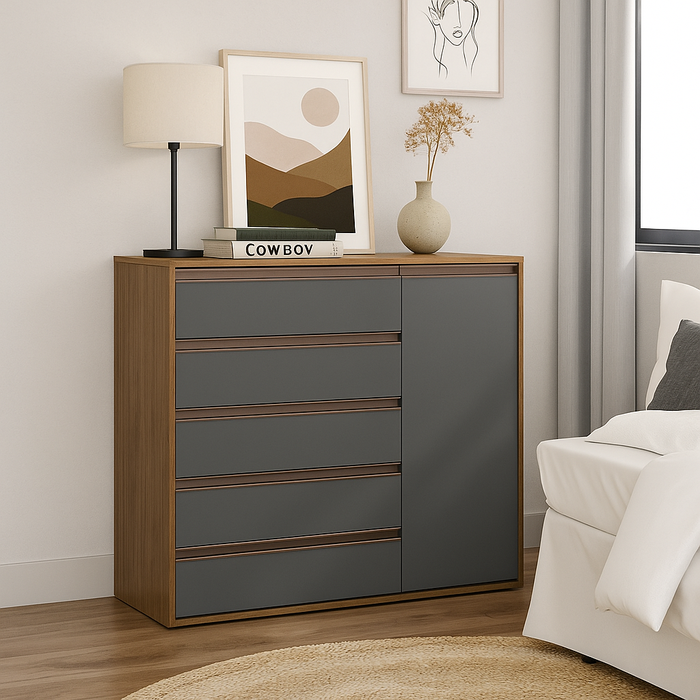 Produto 100% em MDF, Revestido por pintura de alto relevo com 7 camadas de tinta; conferindo beleza, durabilidade e resistência, puxador \"perfil\" em alumínio anodizado champanhe, embeleza e não enferruja, mesmo em regiões litorâneas sob o efeito da maresia; corrediças telescópicas com limitador de saída permitem abertura total da gaveta sem risco de escape oferecendo maior aproveitamento com total segurança; puxador na cor champanhe em alumínio anodizado, não enferrujam, primeira gaveta com divisor colméia, facilitam a organização de objetos e jóias, opcional de cabideiro para calceiro, ou prateleiras para sapateira.