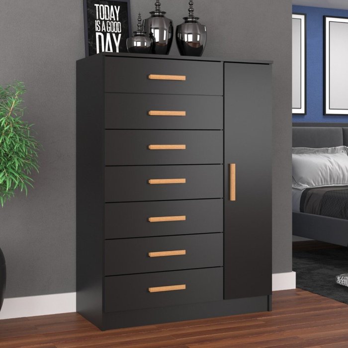 Fabricada com 100% de MDP, este móvel é sinônimo de qualidade e durabilidade. Suas 7 gavetas e 1 porta proporcionam um amplo espaço para você organizar suas roupas, calçados e objetos pessoais de forma prática e eficiente. Puxadores em madeira.