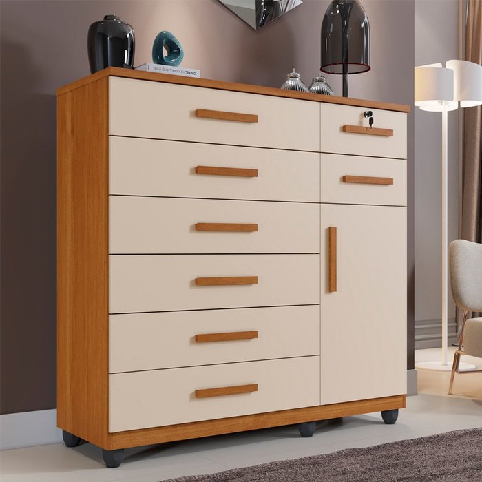 Cômoda New Vitoria Com Porta e 8 Gavetas MDP Cinamomo com Off White