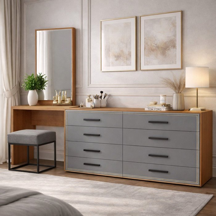 A Cômoda Penteadeira Valência 8 Gavetas da Politorno Móveis é a escolha ideal para quem busca máxima organização, elegância e acabamento superior. Com 160 cm de altura, 209,10 cm de largura e 46 cm de profundidade, oferece amplo espaço interno, perfeito para otimizar a rotina com praticidade. Possui puxadores em MDF, que reforçam a robustez e valorizam o design, além de usinagem nas gavetas, um detalhe exclusivo que confere charme e sofisticação ao móvel. O espelho incluso amplia visualmente o ambiente e traz funcionalidade ao dia a dia. As corrediças telescópicas garantem abertura total, suave e silenciosa das gavetas. O acabamento em pintura UV assegura excelente acabamento, durabilidade e fácil limpeza, mantendo o móvel sempre bonito. Uma peça imponente e versátil, com a qualidade Polit
