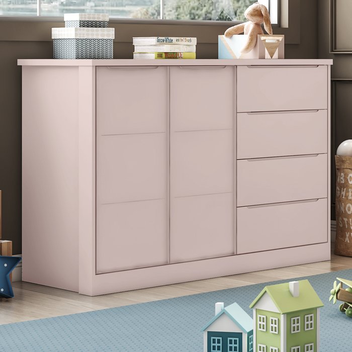 A Cômoda Pérola é um móvel com qualidade e delicadeza. Produzido em MDF 15mm e acabamento em pintura UV (Brilho) atóxica. Possui 02 portas de bater com dobradiças metálicas, 04 gavetas com corrediças telescópicas, cabideiro (montagem opcional), puxadores cava e um amplo espaço interno de armazenamento para acomodar as roupas e acessórios de seu bebê. Perfeito para você que busca um móvel com muito charme para deixar o quarto de seu filho ainda mais encantador.