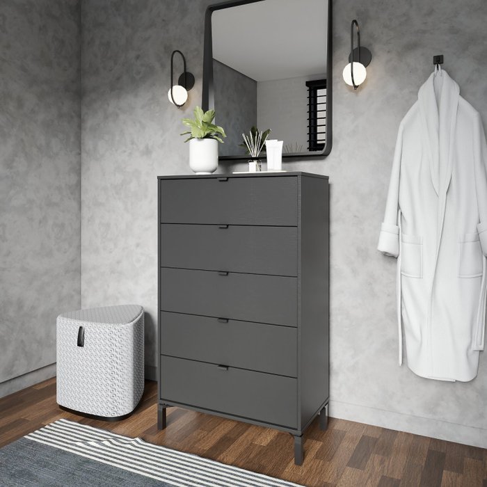 A cômoda Queens possui um visual dinâmico com 5 gavetas altas, adaptando-se para armazenar diversos itens da rotina. Com ótimo espaço de armazenamento e design marcante, ela se destaca em diversos projetos.