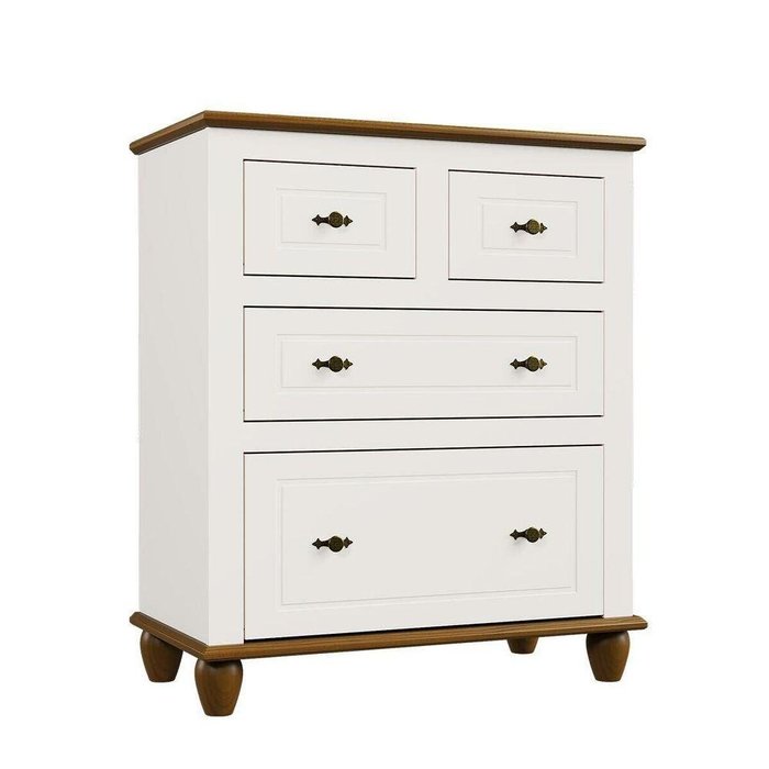 Características principais: -Base e tampo de madeira maciça Pinus Taeda reflorestada, com espessura de 25mm; -Pintura atóxica; -Puxadores padrão textura ouro envelhecido; -Pés robustos e torneados de madeira maciça de Pinus Taeda; -Frente de gavetas com detalhe de linha em baixo relevo; -Estrutura painéis fibra de madeira (MDF 15mm); -Gavetas com corrediças telescópica.
