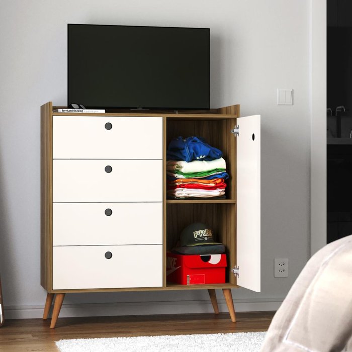 Pensando em agregar ainda mais acomodação e sutileza, criamos a Cômoda Raissa com um design totalmente exclusivo da Lojas RPM. Nosso modelo possui pés em estilo retrô, 4 gavetas com corrediças metálicas que garantem ainda mais durabilidade ao seu produto, uma porta com dobradiças metálicas e 2 compartimentos para armazenar seus acessórios pessoais.Dimensões do produto montado: Altura: 97,5 cm Largura: 90 cm Comprimento: 43,5 cmPeso suportado: Tampo: até 12 kg distribuídos Gaveta: até 4 kg distribuídos em cada Prateleira: até 6 kg distribuídos Peso total suportado: 34 kg bem distribuídos.Observações: - 4 Pés de Pinus; - 1 Porta; - 4 Gavetas com corrediças metálicas; - Puxadores plástico; - Os objetos que ambientam as fotos não acompanham o produto; - O produto será entregue desmontado; - É de inteira responsabilidade do cliente a montagem do produto e/ou instalação, custos de transporte por escadas e/ou elevadores, guincho ou içamento, assim como possíveis avarias provenientes de manuseio inadequado; - Embora o produto acompanhe o manual de montagem, verifique a complexidade antes de decidir montá-lo sozinho, recomendamos que contrate um profissional de sua confiança; - Mantenha as informações de contato e endereço de entrega atualizadas para entrarmos em contato, caso seja necessário; - Fique atento, nossas cores podem sofrer alterações dependendo do seu monitor; - ANTES DE MONTAR O SEU PRODUTO, certifique-se que todas as instruções dispostas no manual, bem como todas as ferragens descritas, estejam presentes dentro da embalagem. Verifique se há alguma peça avariada, caso esteja, prestaremos a devida assistência dentro do prazo da garantia. - Imagens meramente ilustrativas.