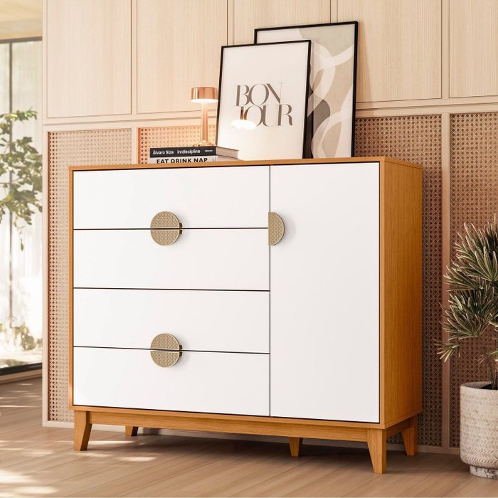 Renove seu ambiente com a Cômoda Sapateira Ipê! Com 1 porta e 4 gavetas, oferece espaço organizado e funcional. Os puxadores de ABS metalizado dourado e os apliques inspirados na palha indiana adicionam um toque de elegância. Sua porta com dobradiças slow motion garante fechamento suave, enquanto os pés em madeira conferem durabilidade e charme. Aproveite a praticidade e o estilo da Cômoda Sapateira Ipê para transformar seu espaço.