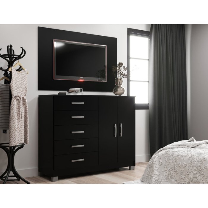 Cômoda Sapateira 2 Portas 5 Gavetas com Pés + Painel para Tv até 55 Polegadas Preto