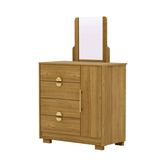 Com 4 gavetas de corrediças metálicas e uma porta lateral com prateleira móvel, oferece versatilidade e organização. Seus pés opcionais na montagem e a moldura lateral proporcionam robustez e acabamento refinado ao produto. Os puxadores com pintura metalizada dourada seguem as tendências de decoração, enquanto as cores modernas adicionam requinte ao ambiente.