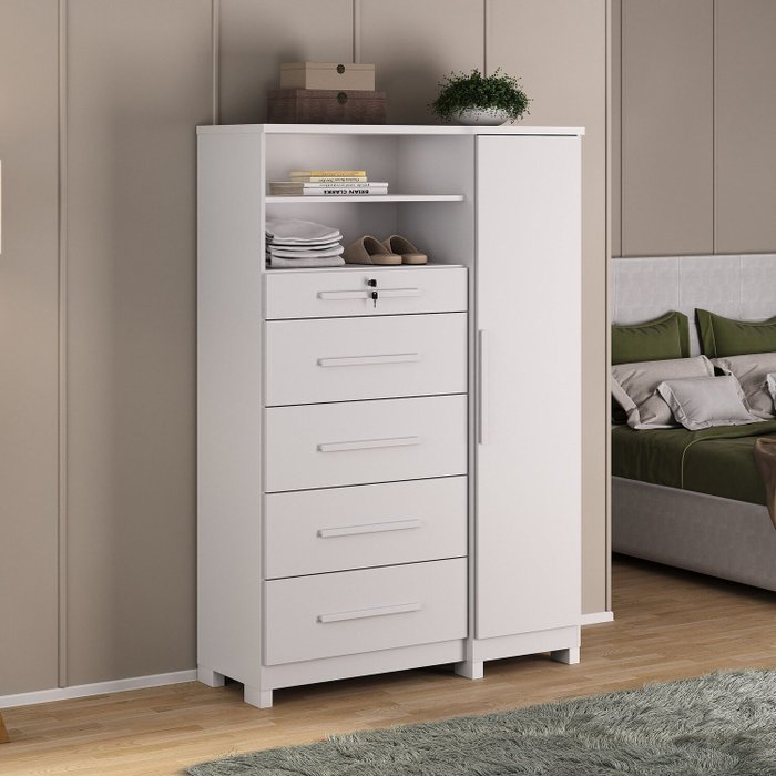Este elegante móvel combina design refinado com praticidade para atender todas as suas necessidades de organização. Características Principais: Estrutura Robusta: Feita com tampo em MDP de 25mm, garantindo durabilidade e resistência; Armazenamento Inteligente: Conta com 1 porta e 5 gavetas espaçosas, equipadas com corrediças telescópicas para um deslizar suave e eficiente; Organização Premium: A primeira gaveta possui divisórias internas para manter pequenos itens organizados e vem com chave para maior segurança; Detalhes Elegantes: Puxadores em MDF que complementam o design sofisticado do móvel; Cabideiro Metálico: Ideal para pendurar acessórios ou itens que precisam estar sempre à mão; Acabamento Impecável: O acabamento interno é igual ao externo, proporcionando um visual uniforme.