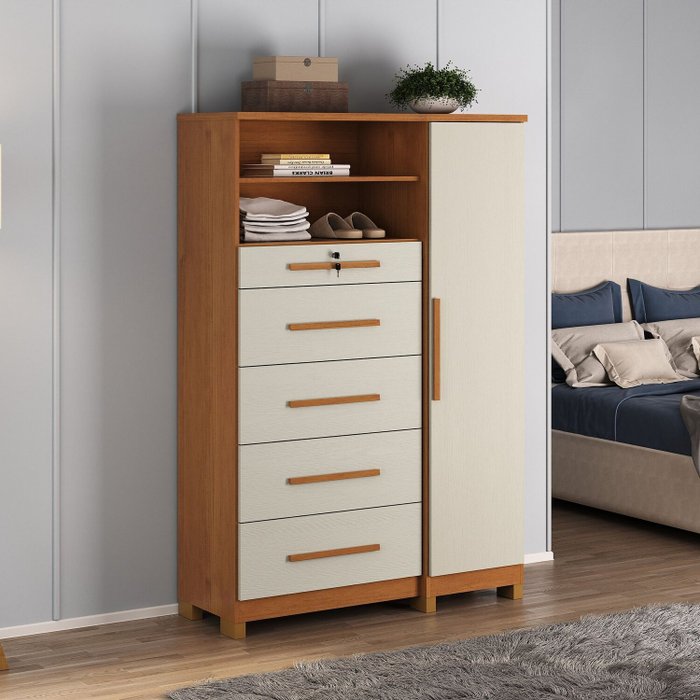 Este elegante móvel combina design refinado com praticidade para atender todas as suas necessidades de organização. Características Principais: Estrutura Robusta: Feita com tampo em MDP de 25mm, garantindo durabilidade e resistência; Armazenamento Inteligente: Conta com 1 porta e 5 gavetas espaçosas, equipadas com corrediças telescópicas para um deslizar suave e eficiente; Organização Premium: A primeira gaveta possui divisórias internas para manter pequenos itens organizados e vem com chave para maior segurança; Detalhes Elegantes: Puxadores em MDF que complementam o design sofisticado do móvel; Cabideiro Metálico: Ideal para pendurar acessórios ou itens que precisam estar sempre à mão; Acabamento Impecável: O acabamento interno é igual ao externo, proporcionando um visual uniforme.
