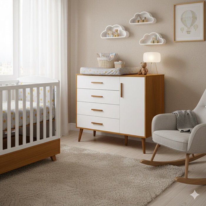 A Cômoda Sapateira Ísis é projetada para combinar funcionalidade, segurança e estilo em um único móvel de armazenamento. Com detalhes cuidadosamente pensados é produzida em 100% MDF, possui 4 gavetas com puxadores em madeira , 1 porta com prateleira interna , sistema antitombamento e um amplo espaço interno para organizar as roupinhas do seu bebê.