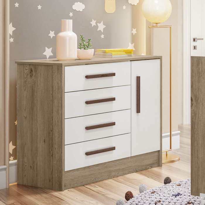 Cômoda Sapateira Q Encanto Branca/Carvalho 4 Gavetas 1 Porta Sistema Antitombamento - QMovi 3710-58