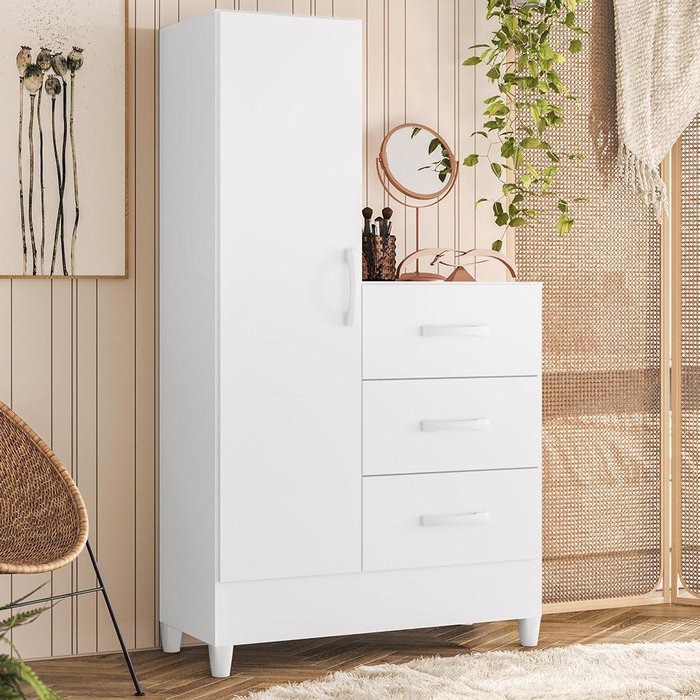 Cômoda Sapateira Quarto Mobi com 3 Gavetas e 1 Porta Branco Fosco/Rosa