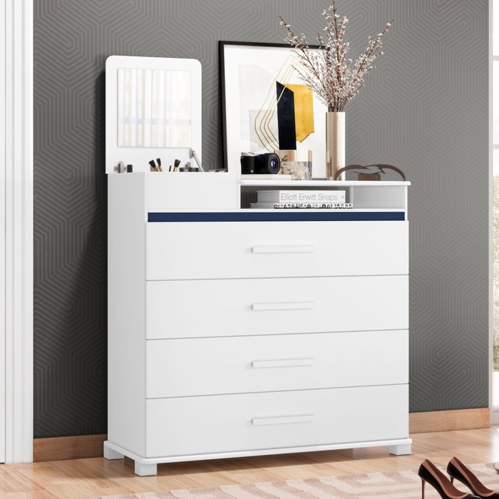 Dispõe de 4 gavetas com profundidade excelente para acomodar todas as suas roupas e também conta com 1 espelho pequeno e 1 Porta Basculante..