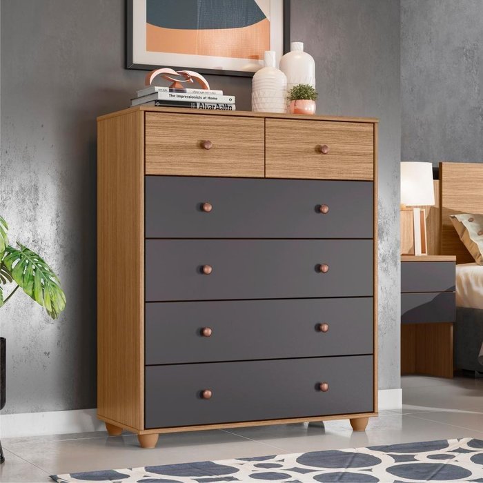 A Cômoda veio para complementar seu quarto trazendo mais sofisticação para o ambiente. 6 gavetas com corrediças telescópicas Reforço estrutural no fundo das gavetas maiores Caixaria e frentes de gavetas em 15 mm. Puxadores com acabamento metalizado bronze. Pés inclusos Interna 100% na cor do produto Dimensões do produto: Altura: 110 cm Largura: 90 cm Comprimento:41 cm Informações complementares: Cor: Nature Titanium