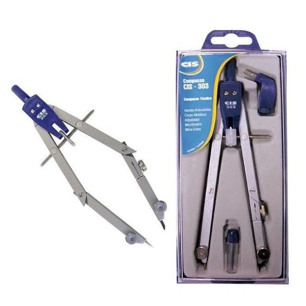Compasso Técnico Cis-303 Composto por Estojo e Mina Extra Compasso Técnico, composto por um estojo e mina extra, prático para manuseio. Indicado para uso profissional, material resistente. Hastes articuladas Adaptador Mina Extra Estrutura Metálica Imagem meramente ilustrativa.