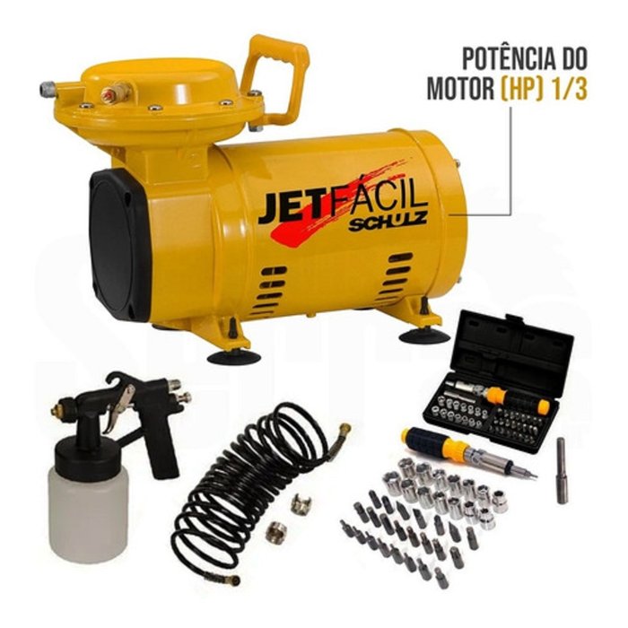 Distribuído Por Casa Das Serras Compressor De Ar Direto C/ Kit Jet Master Schulz Jogo De Soquetes Sextavado C/chave Catraca 40pçs 5520 Titanium Descrição * Compressor De Ar Direto C/ Kit Jet Master Schulz - Por ser um kit completo, o Compressor de Ar Direto Jet Master é perfeito para quem quer comprar seu primeiro compressor para realizar serviços domésticos, já que este produto vem pronto para ser utilizado. - Com opções em 110 e 220 volts, é indicado para pinturas internas e externas. - Excelente para limpeza de casas e itens domésticos, computadores e componentes tecnológicos em geral. - Isento de óleo, o Compressor de Ar Direto Jet Master deixa tudo com acabamento profissional, com o melhor custo benefício do mercado. Especificações - Marca Schulz - Modelo Jet Master - Voltagem : 110v Ou 220v - Deslocamento teórico (pcm) 2,3 - Deslocamento teórico (l/m) 45 - Dimensões do Produto LxAxP (mm) 180 x 245 x 480 - Peso Bruto (kg) 12,3 - Peso Líquido (kg) 11,7 - Potência do motor (hp) 1/3 - Potência do motor (W) 250 - Pressão de Operação Máxima (bar) 2,8 - Pressão de Operação Máxima (lbf/pol²) 40 - Nivel de Ruido (dB A) 76 Acompanha kit de acessórios: 01 Bico de encher pneus; 01 Calibrador de pneus; 01 Mangueira; 01 Pistola para pintura e pulverização; 01 Bico para encher bolas; 01 Bico para limpeza; 01 Pisola Multiuso. * Jogo De Soquetes Sextavado C/chave Catraca 41 pçs 5520 Titanium - Jogo de Soquetes Sextavados de Alta qualidade para uso profissional e hobby. - Kit ideal para aperto e desaperto de porcas, parafusos. - Confeccionado em material de alta qualidade, proporcionando durabilidade a peça. - O kit perfeito composto por 40 peças, com as polegadas ideais para realizar o trabalho que precisar. - Acompanhado de uma catraca reversível e articulada com cabo emborrachado para dar mais conforto no manuseio da ferramenta. Especificações - Marca Titanium - Modelo 5520 Componentes do Jogo: - 1 Catraca reversível e articulada 1/4" - 1 Adaptador - 7 Soquetes em polegadas: 5/32", 3/16", 7/32", 1/4", 9/32", 5/16", 11/32" - 7 Soquetes em polegadas: 4, 5, 5.5, 6, 7, 8, 9 mm - 1 Adaptador para soquetes - 8 Bits Allen: 1/16", 3/32", 1/8", 5/32", 3/16", 7/32", 1/4", 5/64" - 7 Bits Tork: T10, T15, T20, T25, T27, T30 e T40 - 3 Bits Phillips: 1, 2 e 3 - 2 Bits Quadrado: S1 e S2 - 3 Bits Fenda: 3/16", 1/4", 9/32" - Estojo Plástico IMAGENS MERAMENTE ILUSTRATIVAS
