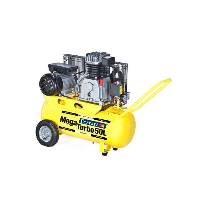 COMPRESSOR DE AR FERRARI MEGA TURBO C50L Referência: AAC1010006 Modelo: Mega Turbo C50L Marca: FERRARI País de origem: CHINA Potência: 3 hp Voltagem: 110/220V Reservatório de ar : 50 Litros Dimensões CxLxA: 80x41x71 cm Peso: 58 Kg Notas:Motor elétrico monofásico , 9,2 Pés Cubicos por Minuto , 115lbs de Pressão , pressão de saída Ajustável com Manômetro , tipo Intermitente , manômetro do reservatório Unidade Compressora: com reservatório de óleo , 52kg