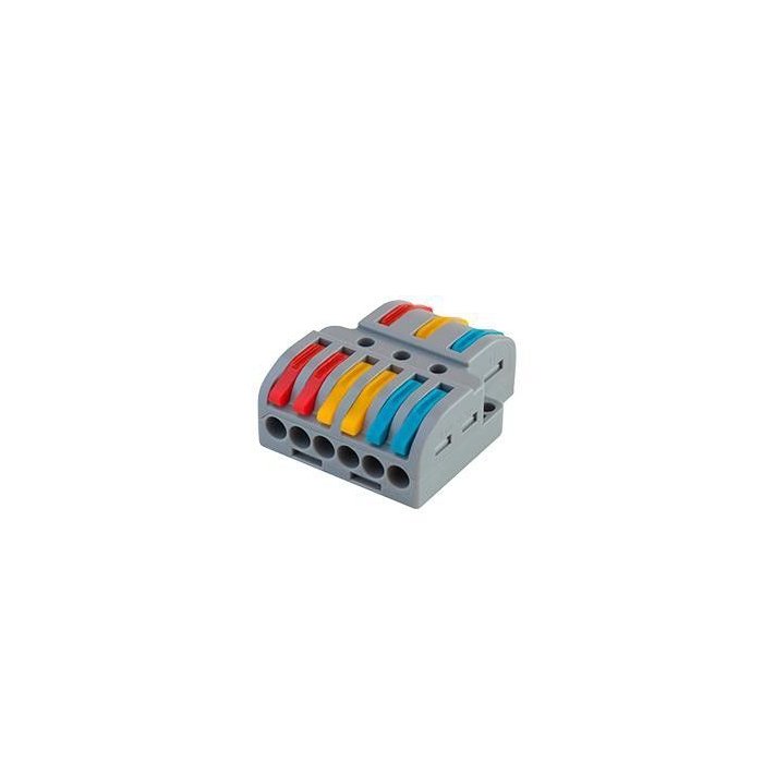 Conector de Emenda e Derivação para fio de 0,5-4mm². Com uma entrada "Fase", "Terra" e "Neutro". 2 saídas de derivação para Fase, Terra e Neutro. Corrente máxima de 32A. Utilizando em instalações elétricas de baixa tensão. Proporciona maior agilidade e segurança nas instalações.