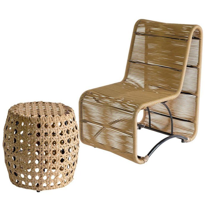 Conjunto Suécia Com 1 Poltrona Em Corda Sintética Palha E 1 Puff Trama Colmeia Teca Estonado