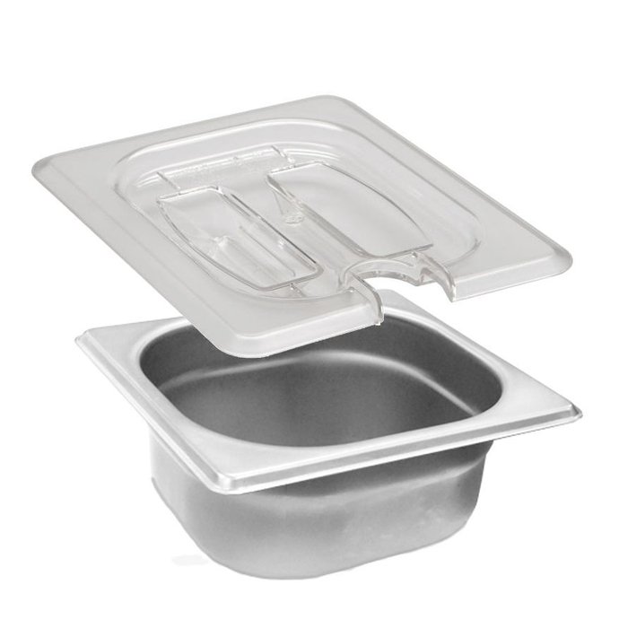 Cuba Gastronômica Inox GN 1/6x65 mm 1 Litro Sem Alça Com Tampa Em Policarbonato Com Abertura Para Colher, Conchas e Afins.