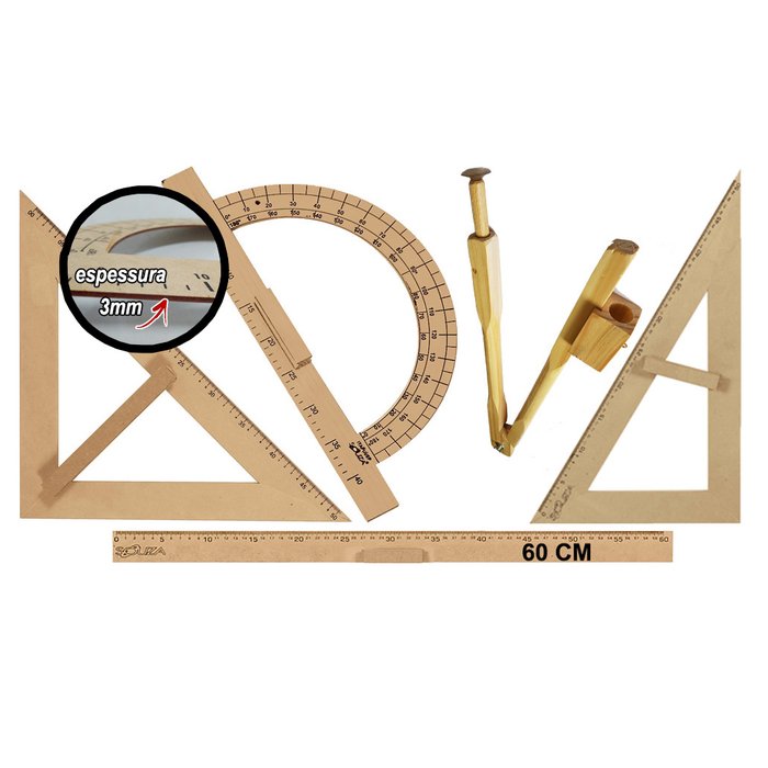 CONJ 5 Kit Geométrico do Professor Mdf Com 5 Réguas 60 cm, 5 Compasso Para Quadro Branco, 5 Esquadro