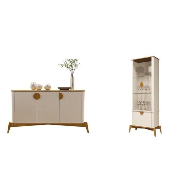 Conj Cristaleira e Buffet Buriti com Os Cantos Curvos, Puxador e Pés em Madeira Maciça OffWhite/Nature