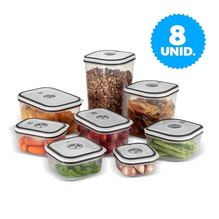 Conjunto de Potes Electrolux Herméticos de Plástico 8 Unidades - 41046083Organize sua cozinha sem trabalho e com um toque de charme. Para quem preza pelo sabor, mas não abre mão da praticidadeIMAGENS MERAMENTE ILUSTRATIVASEspecificações Técnicas:Modelo: 41046083Material: PolipropilenoLivre de BPATampa Easy-Open para fácil aberturaQuantidade de Peças: 8Descrição do Produto:Com acabamento na cor cinza, garante mais modernidade e beleza para sua cozinha.Com design moderno, feitos com material de alta qualidade e livres de BPA, os potes herméticos de plástico Electrolux conservam os alimentos por mais tempo, evitando o desperdício, além de garantir ainda mais beleza para sua cozinha e organização na sua rotina.Máxima organização: formatos inteligentes com tamanhos funcionais e empilháveis que facilitam a organização na sua cozinha.Vedação hermética: com anel de silicone, possuem selagem perfeita que ajuda a preservar e conservar os alimentos e nutrientes por mais tempo.Praticidade e segurança: feito com material próprio para armazenar alimentos e livre de BPA, conta com tampa de fácil abertura e registro de data para controle de armazenamento.Livre de BPA: garante ainda mais saudabilidade na conservação dos alimentos.Versatilidade: pode ser usado no micro-ondas, congelador e ser lavado em lava-louças.Recomendações de uso e cuidado:Não pode ser levado direto à chama nem usado em fogões.Suspenda o uso caso identifique que o produto esteja rachado ou quebrado.Evite o uso de esponja de aço e nylon.Pode ser lavado na lava-louças. Atenção as tampas só podem ser lavadas na prateleira superior da máquina lava-louças.Sistema de vedação com borracha dupla.Pode ser utilizado no micro-ondas, por até 3 minutos, sem tampa.Pode ser utilizado no freezer (até -20ºC ).Ao esquentar óleo ou manteiga no micro-ondas deixe o menor tempo possível.Este produto possui resistência ao calor até 120ºC.Dimensões dos potes com tampa:Pote 1: 95mm x 95mm x 47mmPote 2: 118mm x 118mm x 58mmPote 3: 118mm x 118mm x 68mmPote 4: 118mm x 118mm x 132mmPote 5: 118mm x 118mm x 197mmPote 6: 127mm x 90mm x 67mmPote 7: 148mm x 106mm x 78mmPote 8: 175mm x 125mm x 93mmGarantia: 03 meses pelo fabricante.Pesquisas Relacionadas: potes herméticos, potes mantimentos, kit porta mantimentos, pote de mantimentos, potes, vasilhas plásticas, plásticos, jogo de mantimentos, pote hermético, pote de plástico hermetico.
