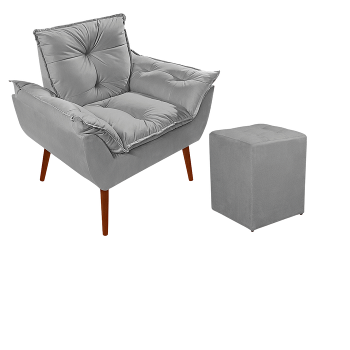 Conjunto 01 Poltrona Opala Decorativa + 01 Puff Quadrado Decorativo Suede Cinza claro