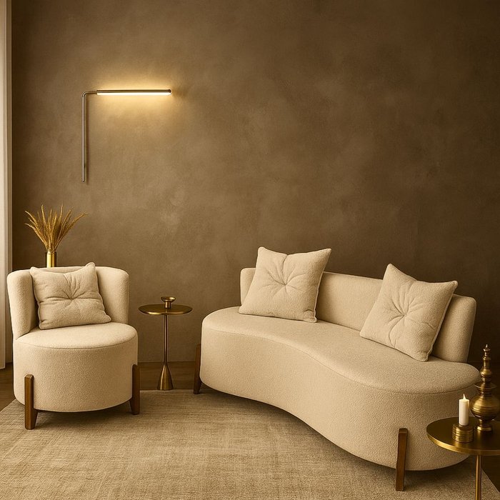 Conjunto 01 Poltrona + Sofá Curvo Orgânico Veludo Bege - Montanaris Decor