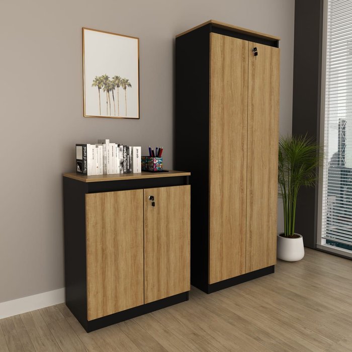 Com um design funcional e acabamento sofisticado na cor Amêndoa e Preto, o Conjunto 2 Armários Baixo e Alto com Chave para Escritório é ideal para quem busca organização, segurança e praticidade no ambiente corporativo. Produzidos em MDP com acabamento em BP e pintura UV, os móveis oferecem excelente capacidade de armazenamento e durabilidade para otimizar seu espaço de trabalho com elegância e eficiência.