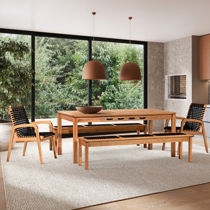 Composto por 1 mesa de 180cm, 2 bancos de 180cm e 2 cadeiras com braço, o conjunto traço oferece conforto para os seus momentos de lazer, formando o ambiente ideal para desfrutar ocasiões de descontração ou confraternizações com seus amigos e familiares. São resistentes e com um design exclusivo. Produzidos com madeira de eucalipto reflorestado e trançado por artesãos da região de São Bento do Sul, Santa Catarina, com corda trançada chata de 2,2 cm, cor preta de polipropileno. Ideal para varandas, sacadas, espaço gourmet ou churrasqueiras e áreas de lazer cobertas, bem como para compor um ambiente aconchegante na sua sala de jantar.