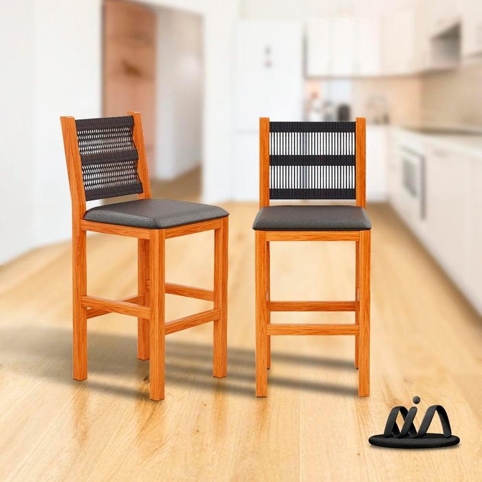 Dimensões dos produtos: Largura 41 cm, Profundidade 43 cm, Altura 100 cm.Itens Inclusos: 2 banquetas- Estrutura 100% madeira maciça- Assento estofado em corino- Espuma D26 no assento- Encosto produzido artesanalmente em corda naval- Confortável e resistente- Podem ser utilizadas em ambientes internos, como sala de jantar, e também em área externa e varandas- Kit inclui 2 banquetasComplexidade da montagem: Média, pode ser montado por mais de uma pessoa e/ou necessite de maior conhecimento para montagem.Recomendações de uso, manutenção e limpeza: Limpar com flanela ou pano macio seco, não utilizar produtos abrasivos, desengordurantes, álcool ou solvente. Não expor o produto diretamente a luz solar e à umidadeGarantia: 3 mesesOBS: Foto meramente ilustrativa, objetos, utensílios e decoração não fazem parte do produto.