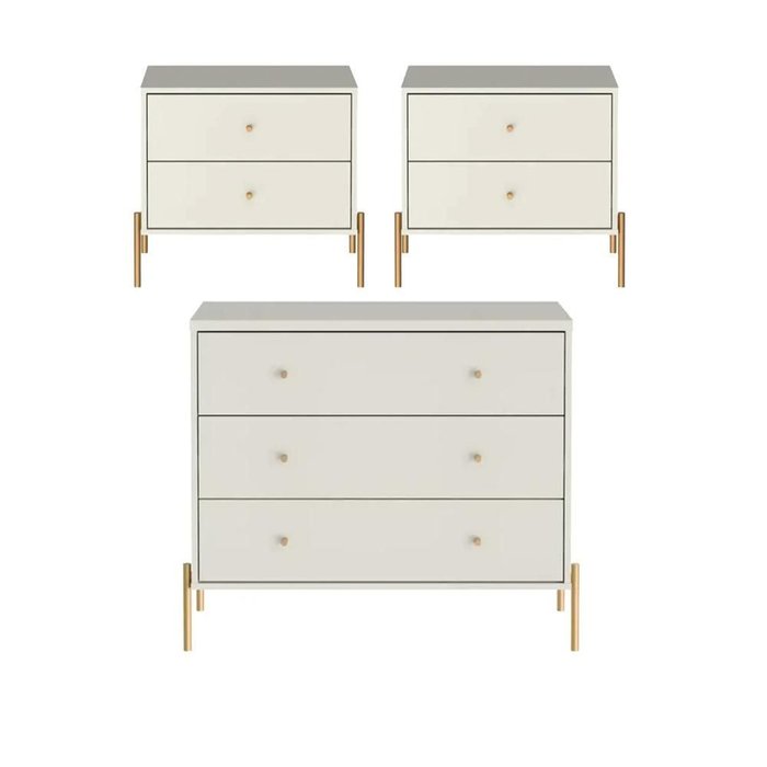 Conjunto 2 Mesas de Cabeceira e Cômoda 3 Gavetas Jasper - Off White Fosco C/ Dourado